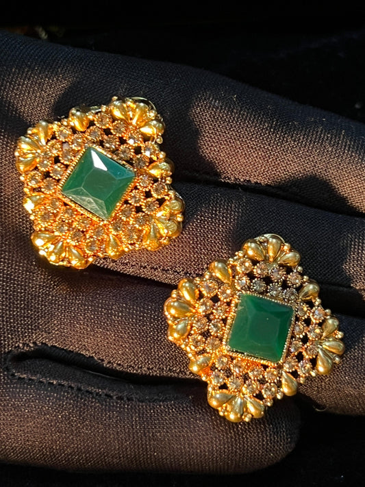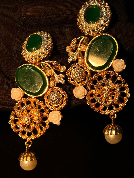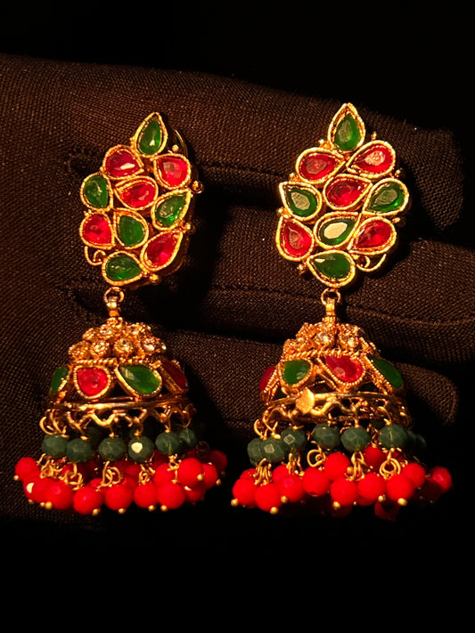 Elegant Green Stone, red stone & Pearl Gold-Plated Earrings - Premium Jewelry for Weddings & Parties in Pakistan