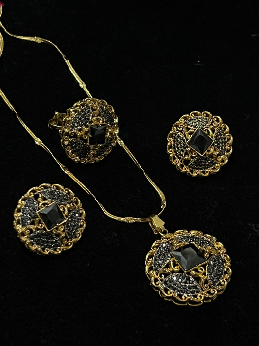 Elegant Black and Gold Jewelry Set - Necklace and Earrings with Black & Red Gemstones & Crystal Accents