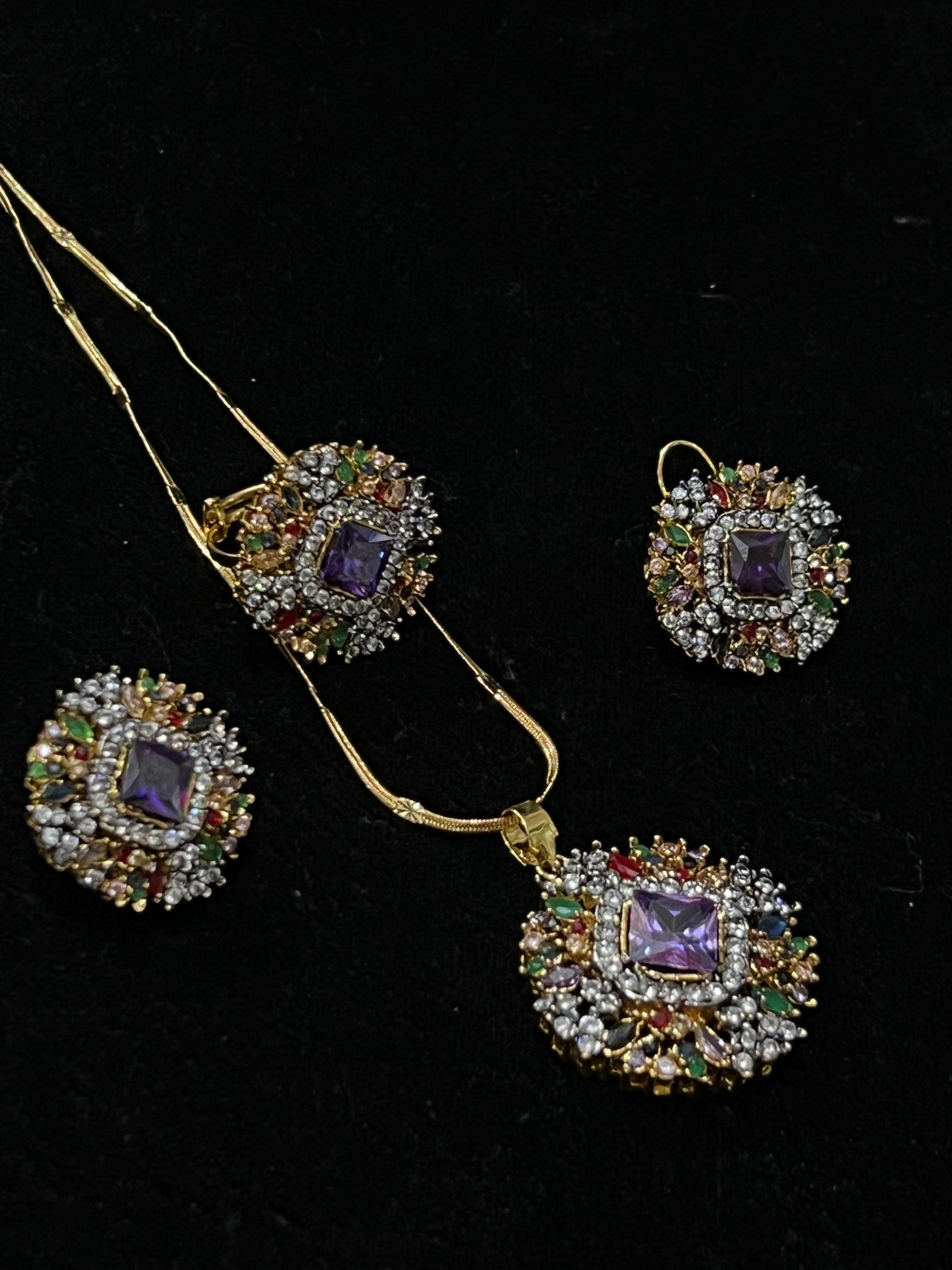 Add a touch of glamour to your outfit with this Elegant Colorful Crystal Necklace and Earring Set. Crafted with intricate detailing, this vintage-inspired jewelry features a stunning centerpiece with a purple stone surrounded by multicolored crystals and sparkling accents. Perfect for special occasions, parties, or as a statement accessory, this set combines timeless elegance with vibrant colors. Made with high-quality materials, it offers durability and long-lasting shine. Elevate your jewelry collection with this exquisite antique-style jewelry set that captures attention and showcases your unique style.